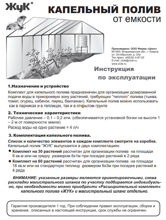 Капельный полив ЖУК от емкости 30 растений используется для полива растений в парниках и теплицах, а также на открытом грунте.