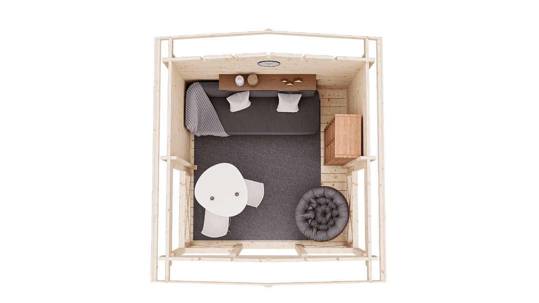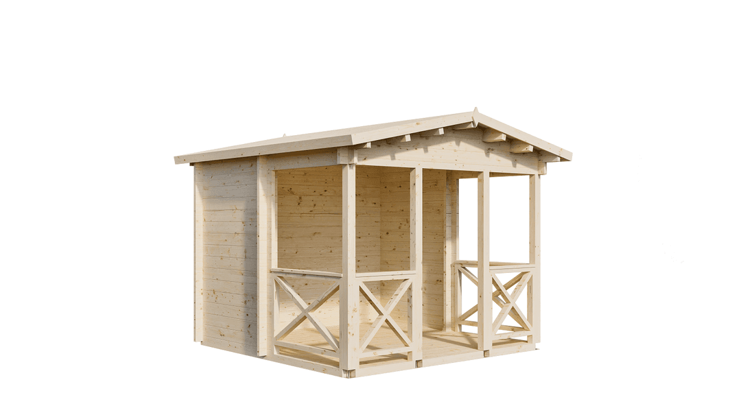 Беседка площадью 7,3 м² сочетает в себе открытую и закрытую зоны: одна половина представляет собой открытое пространство с ограждением, идеальное для отдыха на свежем воздухе, а вторая — уютная закрытая с трех сторон часть, обеспечивающая защиту от ветра и непогоды. Двускатная кровля придает беседке эстетичный вид и надежно защищает от осадков.