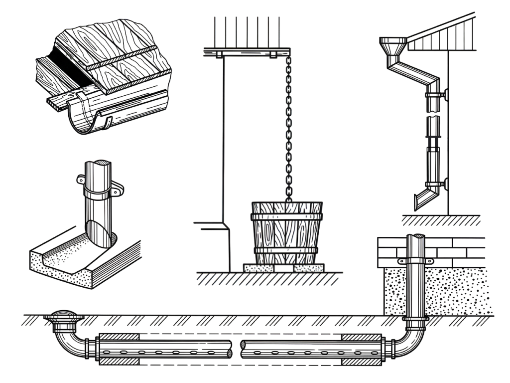 Сливные элементы направляют воду от здания.